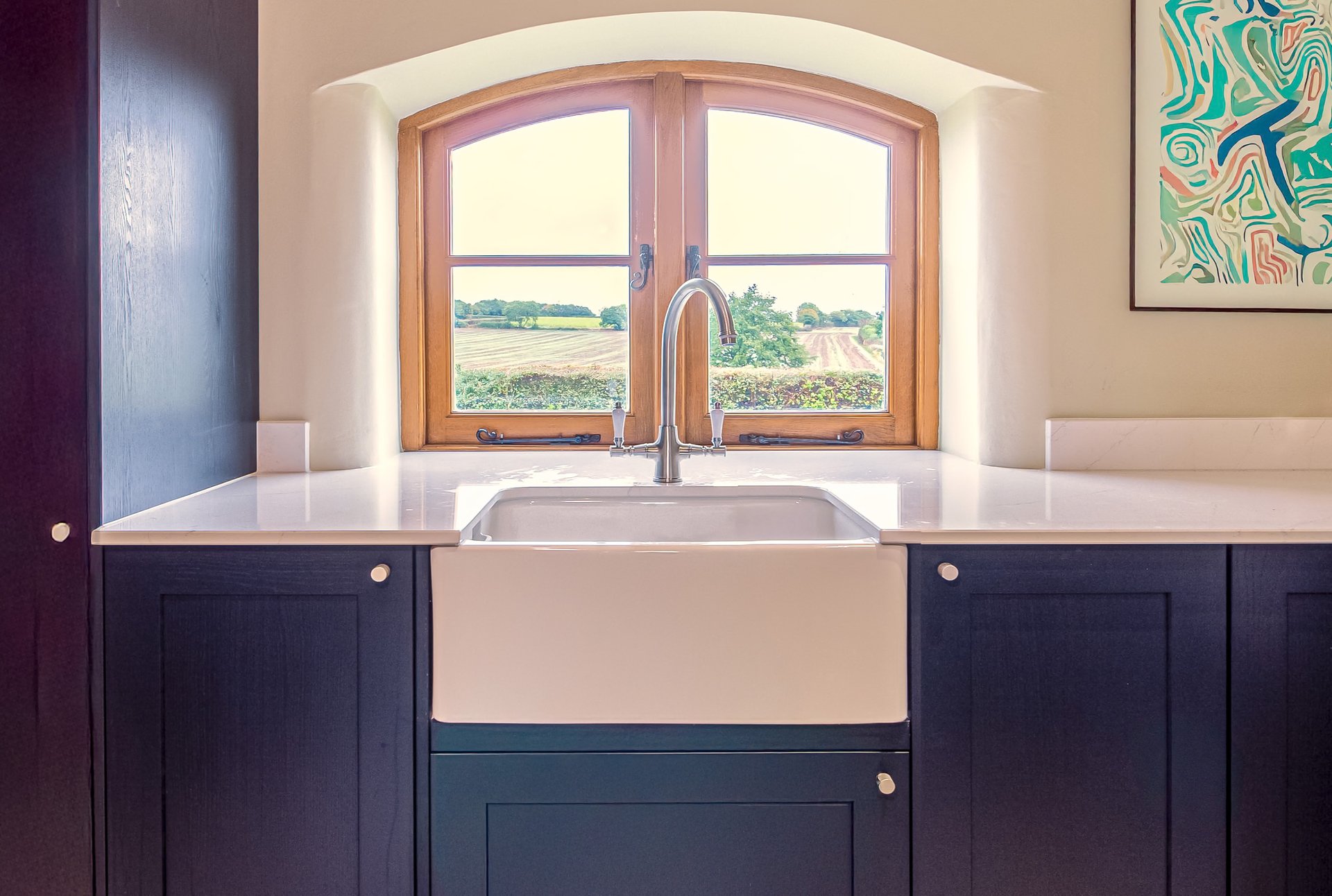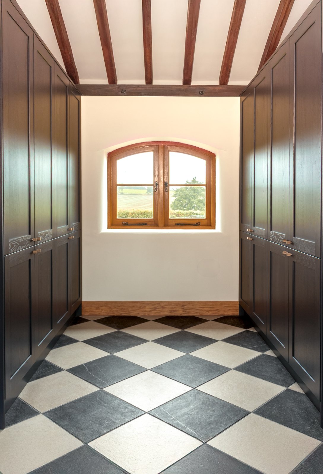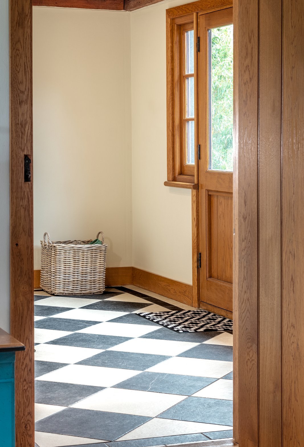 In the utility room, dark blue units were carefully selected to balance the overwhelming wooden elements, providing a contemporary feel. The outdated stone tiles were replaced with striking black and white checkerboard, creating a fresh and stylish backdrop. The result showcases a harmonious blend of functionality and aesthetic appeal, breathing new life into this area.